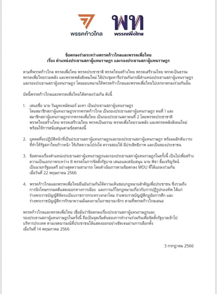 บัดนี้พรรคก้าวไกลและพรรคเพื่อไทยได้ตกลงร่วมกัน ดังนี้