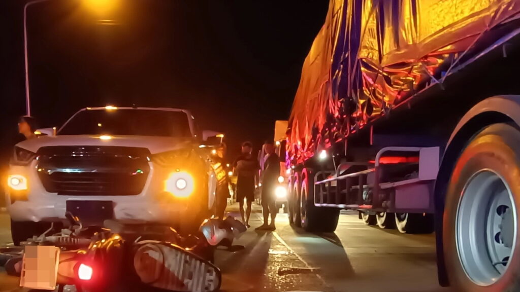 นครสวรรค์-เกิดอุบัติเหตุกลางสี่แยกไฟแดง อ.ตากฟ้า ลุงวัย 71 ปีขี่จักรยานยนต์เฉี่ยวรถกระบะจนร่างกระเด็นมุดใต้รถบรรทุก ถูกล้อทับดับสลด