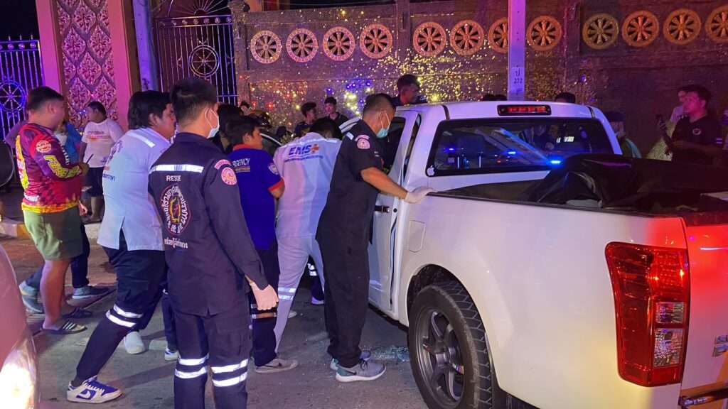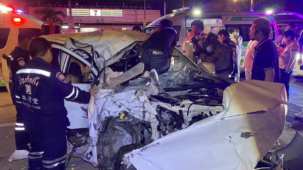 ที่เกิดเหตุบริเวณหน้า วัดแพรกษา สมุทรปราการ เจ้าหน้าที่กู้ภัยมูลนิธิปอเต็กตึ้ง พบ รถยนต์กระบะ 4 ประตู ยีห้ออีซูซุ อยู่ในสภาพด้านหน้าพังยับเยินแทบกลายเป็นเศษเหล็ก โดยภายในห้องโดยสาร เจ้าหน้าที่กู้ภัย พบ ผู้เสียชีวิตถูกอัดก๊อปปี๊ติดอยู่ภายในซากรถ จำนวน 3 ราย เจ้าหน้าที่กู้ภัยต้องใช้อุปกรณ์เครื่องตัดถ่าง ในการตัดถ่างโครงสร้างรถคันดังกล่าวเพื่อนำร่างผู้เสียชีวิตออกมา ซึ่งไม่นานเจ้าหน้าที่กู้ภัยก็สามารถนำร่างผู้เสียชีวิตทั้งหมดออกมาจากซากรถได้ ใกล้กันพบ รถบัสโดยสารรับส่งพนักงาน จอดอยู่ข้างทาง บริเวณด้านท้ายมีร่องรอยการถูกเฉี่ยวชนอย่างแรงจนพังเสียหาย ไหลไปไกลกว่า10 เมตร โดยมีโชเฟอร์รถบัสยืนรอให้การกับเจ้าหน้าที่ตำรวจ