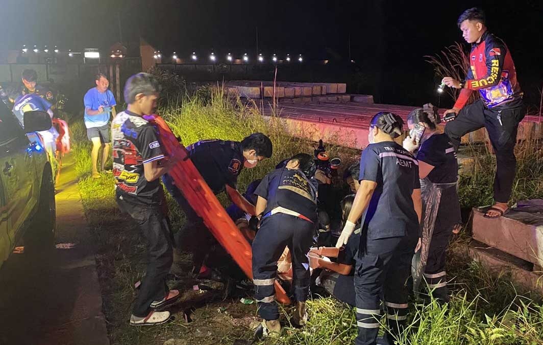 ด้านเจ้าหน้าที่กู้ภัย เล่าว่า ศูนย์วิทยุตำรวจภูธรแจ้งอุบัติเหตุ จึงนำกำลังมาช่วยเห็นผู้บาดเจ็บนอนคว่ำ จึงพลิกให้นอนหงาย และพบว่าหน้าอกเป็นแผลฉกรรจ์ทะลุถึงหัวใจและปอด คาดว่าน่าจะเกิดจากรถล้มแล้วรถทับร่างคนเจ็บลงไปบนเสาเหล็กที่มีลักษณะกลวง ที่เป็นที่ตั้งเสาเต็นท์คนงานก่อสร้าง ทำให้เสาเหล็กทิ่มเข้าไปในอกของคนเจ็บจนอาการสาหัสดังกล่าว