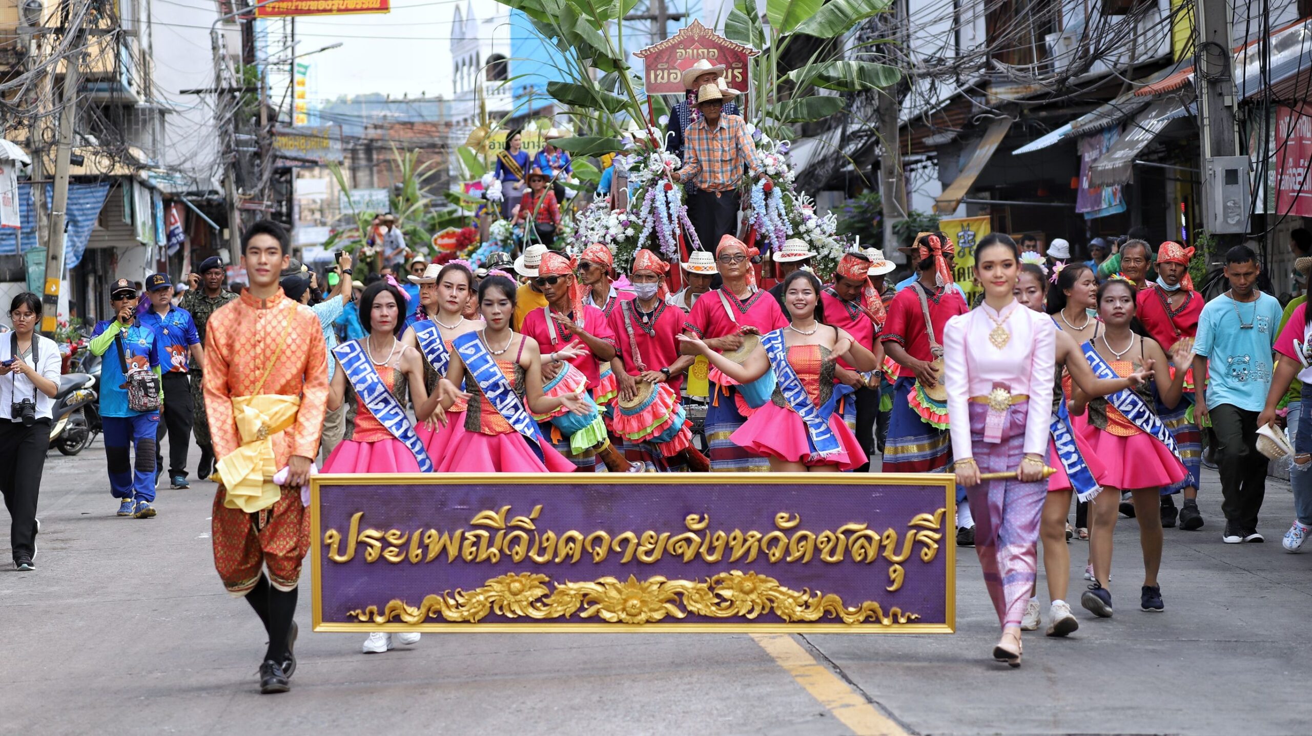 โดย นายธวัชชัย ศรีทอง ผวจ.ชลบุรี ได้นั่งเกวียนกัณฑ์ คู่กับนางสาวประภัสรา ศรีทอง นายกเหล่ากาชาดจังหวัดชลบุรีและ น้องนางบ้านนา (ผู้ชนะเลิศประกวดนางงามวิ่งควาย)แห่ขบวนริ้วเกวียนกัณฑ์ทั้งหมด 13 เล่ม แห่ควายประเภทสวยงาม แห่ไปรอบตลาดเมืองชลบุรี สร้างความสนใจให้กับนักท่องเที่ยวชาวไทยและนักท่องเที่ยวชาวต่างชาติ รวมถึงสื่อมวลชนชาวต่างชาติ ต่างมาบันทึกภาพและรายงานข่าวกิจกรรมงานประเพณีวิ่งควาย จ.ชลบุรี กันอย่างหนาตา เพื่อนำไปเผยแพร่ทั่วโลก