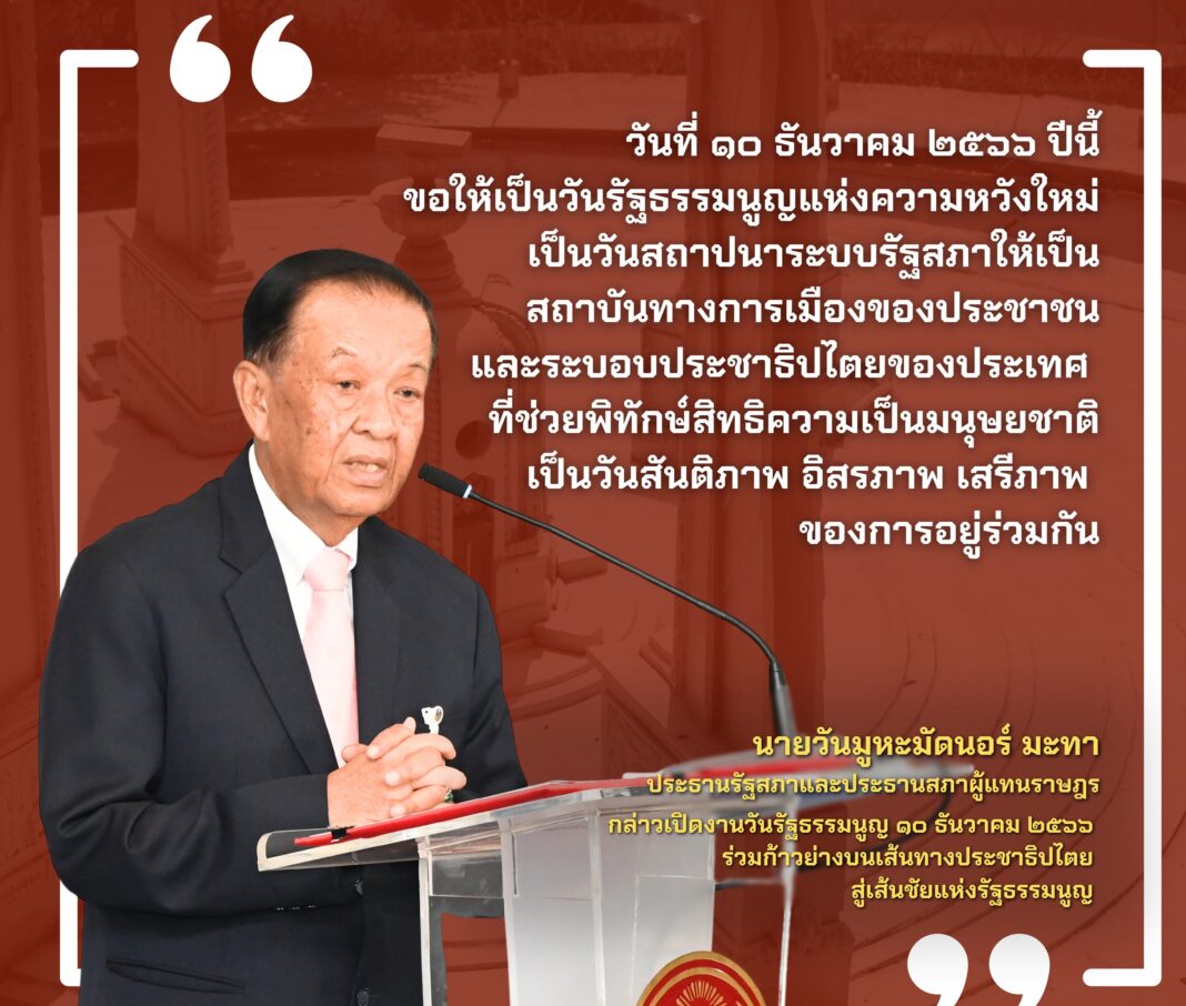 โอกาสนี้ ประธานรัฐสภา กล่าวว่า วันที่ 10 ธันวาคม ของทุกปี เป็นวันที่ทางราชการ กำหนดให้เป็นวันที่ระลึกถึงวโรกาสที่พระบาทสมเด็จพระปกเกล้าเจ้าอยู่หัว ทรงพระกรุณาโปรดเกล้าฯ พระราชทานรัฐธรรมนูญแห่งราชอาณาจักรสยาม พุทธศักราช 2475 เพื่อเป็นกฎหมายสูงสุดเป็นหลักในการปกครองประเทศ และเป็นฉบับถาวร เมื่อวันที่ 10 ธันวาคม 2475 เราเรียกวันนี้ว่า “วันรัฐธรรมนูญ” โดยวันรัฐธรรมนูญ ไม่เพียงเป็นวันหยุดราชการ เพื่อระลึกถึงวันสำคัญทางการเปลี่ยนแปลงประวัติศาสตร์การปกครองของราชอาณาจักรสยามเท่านั้น ยังมีจุดประสงค์เพื่อให้ชนในชาติได้ระลึก ตระหนักถึงความเป็นเอกราชของรัฐ ภายใต้การปกครองอิสระที่มีกฎ มีเกณฑ์ เคารพ สิทธิ หน้าที่ และเสรีภาพของบุคคล และความเป็นธรรมของมนุษยชาติ ตลอดจนการใช้อำนาจในการดำเนินกิจการต่าง ๆ อย่างสมดุลแก่กันและกันด้วย ซึ่งเป็นเจตนารมณ์หลักของรัฐธรรมนูญตามระบอบประชาธิปไตย