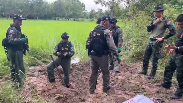 เมื่อวันที่ 23 ก.ย. 2568 ผู้สื่อข่าวรายงานว่า ที่คลองส่งน้ำติดแนวชายแดนไทย–กัมพูชา บ้านหนองหว้าต.เสาธงชัย อ.กันทรลักษ์ จ.ศรีสะเกษ นายผู้ใหญ่บ้านหนองหว้าได้รับแจ้งจากลูกบ้านว่าพบวัตถุต้องสงสัยคล้ายลูกกระสุนปืนใหญ่ ระหว่างออกไปกรีดยางพาราในพื้นที่ชายแดน