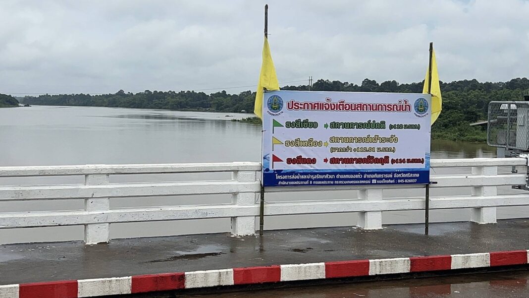 โดยอ่างเก็บน้ำตามแนวชายแดน 16 แห่ง ตอนนี้มีน้ำล้นตลิ่งแล้ว 12 แห่ง ซึ่งวันนี้เป็นวันแรกของลำน้ำห้วยทับทัน ที่เกินปริมาณกักเก็บล้นตลิ่งซึ่งได้แจ้งข่าวเตือนพี่น้องประชาชนไปแล้ว ตั้งแต่เมื่อคืน ถ้าเกิดจุดไหนอันตราย ทางกรมชลประธาน ก็จะขึ้นธงแดง แต่ตอนนี้มีทองเหลือง ขึ้นแล้วหลายแห่งด้วยกัน
