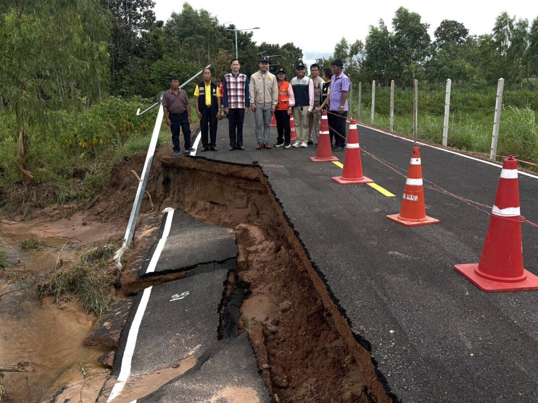 อำนาจเจริญ-อิทธิพลของพายุฝนที่ตกกระหน่ำลงมาในพื้นที่อย่างต่อเนื่อง ส่งผลให้ถนนระหว่างหมู่บ้านที่จังหวัดอำนาจเจริญที่พึ่งสร้างเสร็จ เกิดชำรุด ทรุดตัวยาวกว่า 10 เมตร