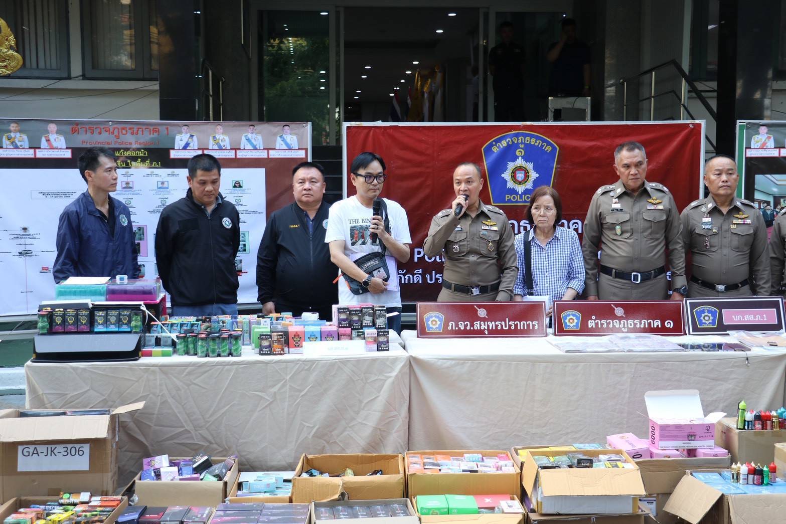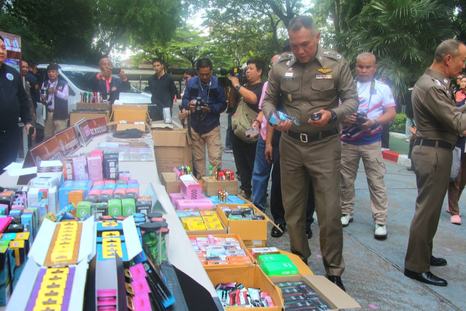 ผช.ผบ.ตร.และ ผบช.ภ.1 แถลงข่าวร่วมกันจับกุมแก๊งคลอฯพร้อมบุกยึดบุหรี่ไฟฟ้า
