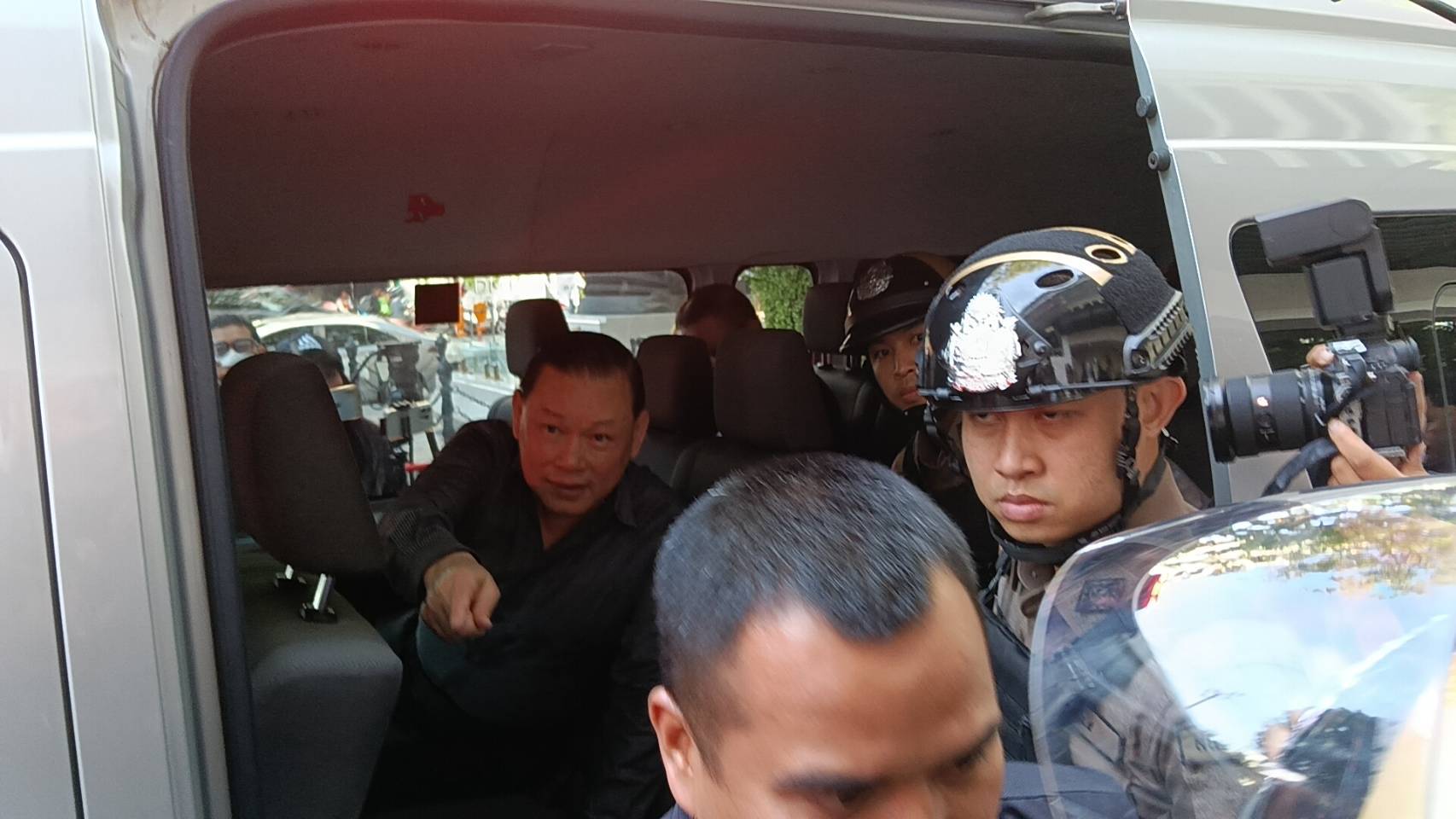 ด้านกำลังเจ้าหน้าที่ สน.ทองหล่อ ได้จัดรถตู้พร้อม ชุดเคลื่อนที่เร็วประกบหน้า-หลัง และรถกระบะอีก 1 คัน คอยดูแลความปลอดภัยระหว่างนำตัวนายสันธนะและพวกไปศาล